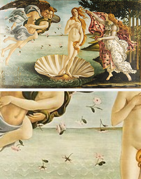 ※『ヴィーナスの誕生』、下記の拡大した部分の違和感(ピンク色の花びらだけだったように思いませんか?)