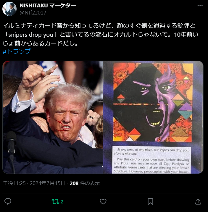 トランプ氏 暗殺未遂と、イルミナティカードの符合についてのポスト
