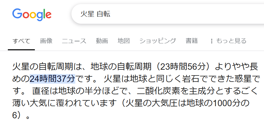 ※ 火星の自転周期は、24時間37分ですが(もう少し長い)約25時間と思ってませんでしたか?