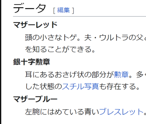 ・ ウルトラの母ブレスレット?? 2025年07月04日 ※ ウルトラの母の青いブレスレット(マザーブルー)、いつから気づいてましたか?(1973年からブレスレットあり、ご意見コメント頂ければ幸いです。)◎ 下記の wiki からの切り取り画像、2023年の記事で使っていたのですが(マザーブルーについては)スルーしておりました・・◎ウル母、過去記事 < 前の記事次の記事 > コメント コメント一覧 (1) 1. 40代 2025年07月05日 13:23 青いブレスレットは記憶にないですね。画像検索だと付けている方がデフォで驚きです。 コメントフォーム 名前 コメント 評価する リセット リセット 顔 星 投稿する 情報を記憶