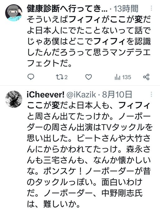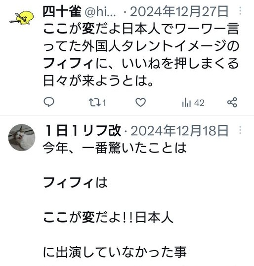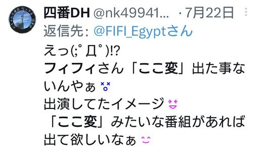 ・フィフィさんは『ここ変』に出た事がない 2025年08月18日 ※ (二年ほど前に気づいていましたが)単独記事に しそびれていました案件、フィフィさんが『ここがヘンだよ日本人』に出演していた記憶ありませんか?◎ ご本人& 「ここ変」ご出演記憶ありポスト < 前の記事次の記事 > コメント コメントフォーム 名前 コメント 評価する リセット リセット 顔 星 投稿する 情報を記憶