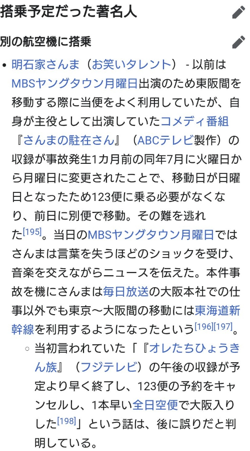 ➁ 明石家さんま さんが、123便搭乗を回避されたのも有名な話ですが、ひょうきん族の収録が早く終わったので、早い時間の全日空便に変えて難を逃れた と思ってませんでしたか?(現在の世界線では)wiki によりますと『さんまの駐在さん』の収録日が(1ヶ月前に)変更されたため・・(ひょうきん族の影響説は誤り)とあります