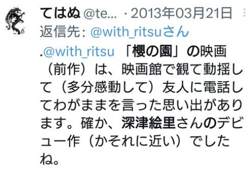 ・ 深津絵里さんは、『櫻の園』に出ていない 2025年09月05日 ※ 深津絵里さん、映画『櫻の園(1990年)』に ご出演されていた記憶ありませんか?(現在の世界線では、ご出演されていません。)◎ 深津さんと「櫻の園」 ポスト◎ あと、深津さんは(1973年1月11日生まれ、当記事作成時点)52歳でいらっしゃいますが、編者の記憶では 2025年度で、57歳になられるお歳だったはずなのですが・・皆さんのご意見コメント頂ければ幸いです。 < 前の記事次の記事 > コメント コメントフォーム 名前 コメント 評価する リセット リセット 顔 星 投稿する 情報を記憶