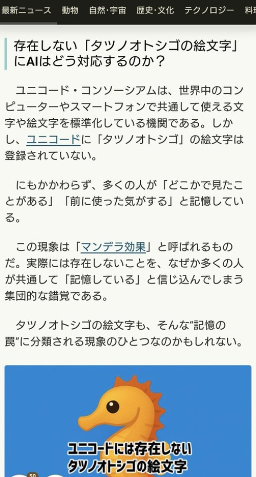 へえ〜本当だなんでだろと思ったらそもそもタツノオトシゴの絵文字ってないんだ AIもマンデラエフェクトに巻き込まれている