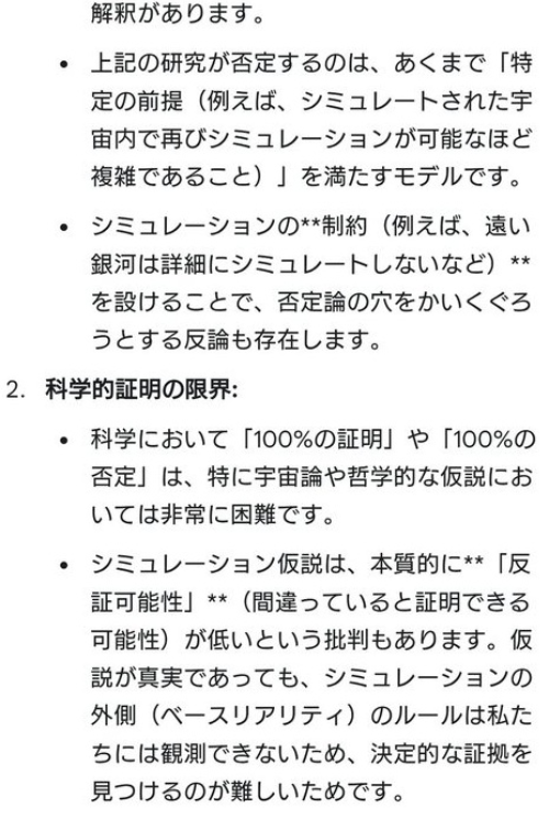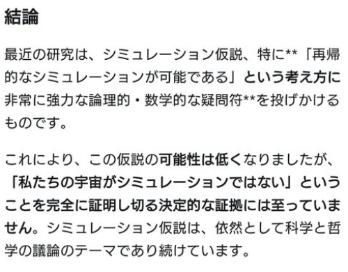 この研究は「アルゴリズム(計算)主体のシミュレーションモデル」に対して、数学的・理論的に反論を構築しています。つまり「もしシミュレーションであるならこういう構造があるはずだ」という仮定に対して「その構造はあり得ない(少なくともアルゴリズム的には)」という反論です。ですから、「あらゆる種類のシミュレーション」が完全に否定されたわけではありません。