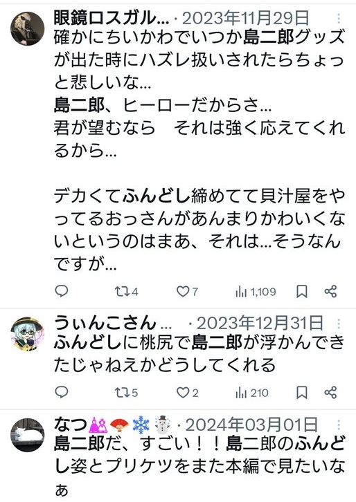 ・ 続、島二郎の ふんどし消滅案件 2025年11月27日 ※(現在の世界線では履いていない)島二郎のふんどし についてのポスト◎ 引き続き、皆さんのご意見等コメント頂ければ幸いです。 < 前の記事次の記事 > コメント コメント一覧 (2) 1. 名無しのマンデラー 2025年11月27日 18:08 ちいかわファンです。びっくりです。島編もXでリアタイしていてファンのリプライまで毎回見ていました。 あの人型ビジュアルで元から褌なし尻丸出しだったならリプライで騒がれていたはずですし、私自身も強く印象に残っているはずです。 それにしてもまさかちいかわがマンデラするとは……。 本当になんなんだマンエフェ……。 2. マンエフェ情報局、編者 江藤 2025年11月28日 00:08 >>1 映画化発表に合わせての改編でしょうか?。 映画で、ケツ丸出しを描く? コメントフォーム 名前 コメント 評価する リセット リセット 顔 星 投稿する 情報を記憶