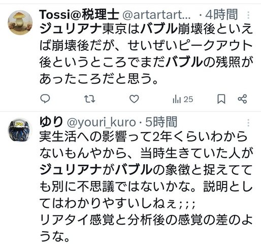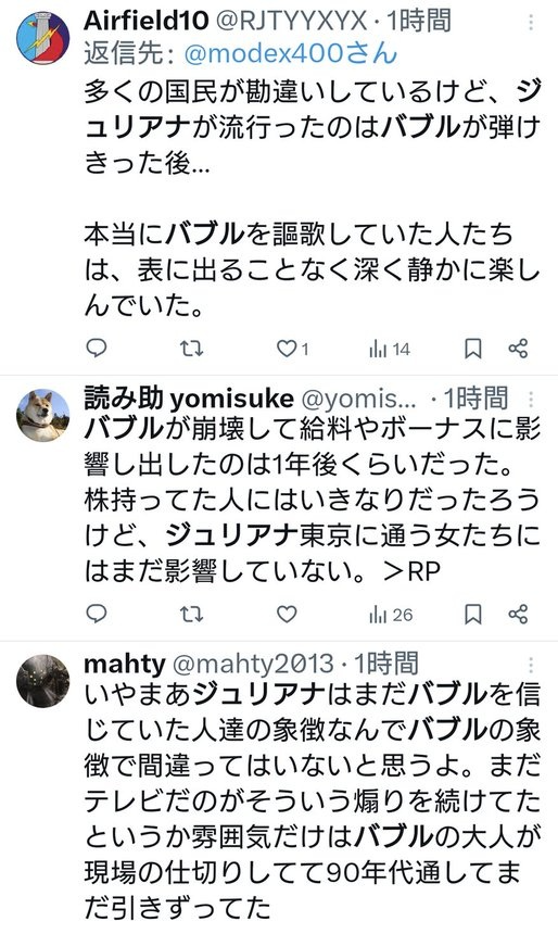 ・ 続、ジュリアナ案件 2026年02月09日 ※ ジュリアナ東京、オープンがバブル後(違和感)案件ですが(数字上の)経済指標と 景気実感とのタイムラグ説も有力です。(お立ち台と言えば)荒木師匠、もっと上の世代のかた だったようにも思うのですが・・引き続き、皆さんのご意見コメント頂ければ幸いです。◎ ジュリアナとバブル期についてのポスト < 前の記事次の記事 > コメント コメントフォーム 名前 コメント 評価する リセット リセット 顔 星 投稿する 情報を記憶