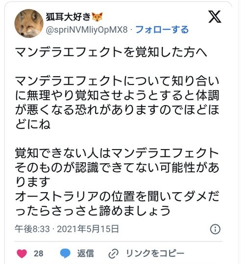 ※ マンデラエフェクトについて、リアル会話で広めようとした場合等に 体調不良になる事例がある事は(2020年の)初期記事から申し上げておりますが(マトリックスの秩序維持プログラム?)、改めて 注意喚起も兼ねて記事にしておきます。マンエフェ情報局としましては、SNSのみでの拡散を推奨しております。SNSのみの場合でも、高次存在(マトリックスの管理者)への『畏敬の念』がないと続けにくいようです。